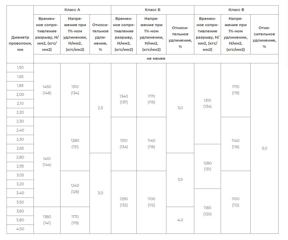 1. Диаметром от 1,50 до 4,50 мм. 2. По механическим свойствам: класс А, Б, В. 3. По предельным отклонениям и поверхностной плотности цинка: группа 1, 2. 4. По назначению: